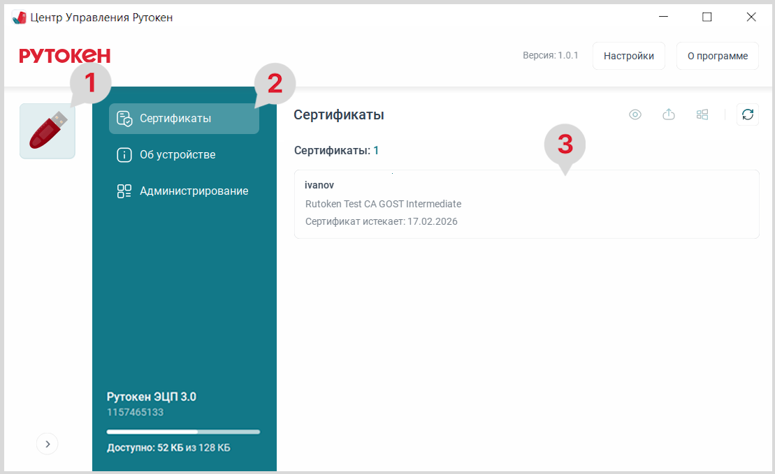 - На боковой панели для выбора устройства нажмите на нужный Рутокен.