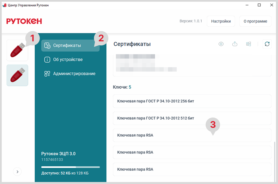 - На боковой панели для выбора устройства нажмите на нужный Рутокен.