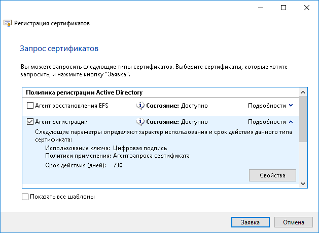 - Выберите тип сертификата Агент регистрации (Enrollment Agent), разверните окно подробной информации и нажмите кнопку Свойства (Properties).
