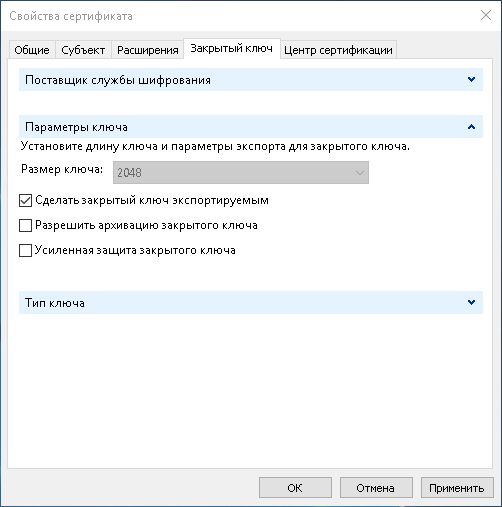 - Перейдите на вкладку Закрытый ключ (Private key), разверните меню Параметры ключа (Key options) и включите опцию Сделать закрытый ключ экспортируемым (Make private key exportable).