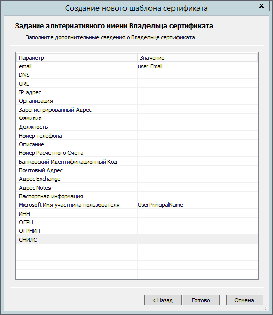 Задайте альтернативное имя Владельца сертификата и нажмите Готово.