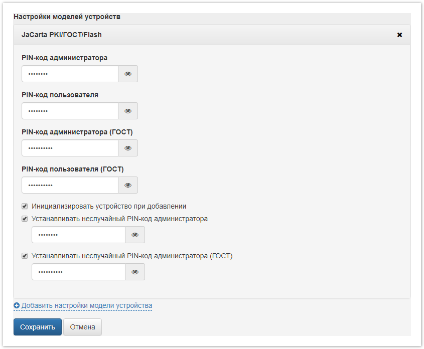 Rutoken KeyBox позволяет установить отдельные параметры для добавления устройств различных моделей. Функциональность поддерживается для устройств Рутокен, JaCarta, eToken PRO Java 72K и IDPrime MD.