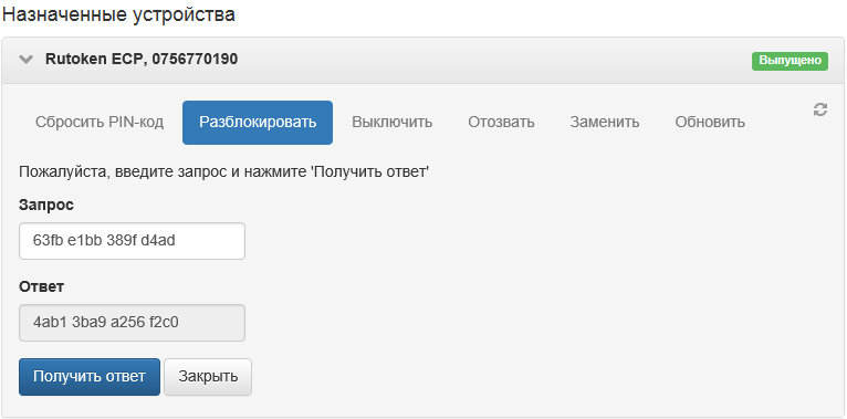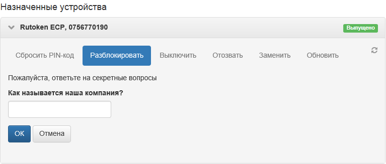 Оператор системы открывает карточку пользователя и в перечне действий над устройством выбирает пункт Разблокировать. Прежде чем выполнить генерацию ответного кода для разблокировки устройства, администратор системы задает секретный вопрос (или несколько вопросов, в зависимости от настроек политики использования устройств) и вводит полученный от пользователя ответ в соответствующую форму.