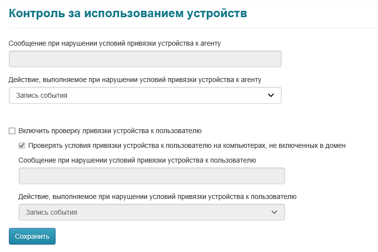 Контроль за использованием устройств осуществляется при помощи клиентского агента Рутокен KeyBox, устанавливаемого на рабочие станции пользователей. В разделе задаются действия и тексты сообщений (опционально), которые будут выполняться при нарушении правил использования устройств.